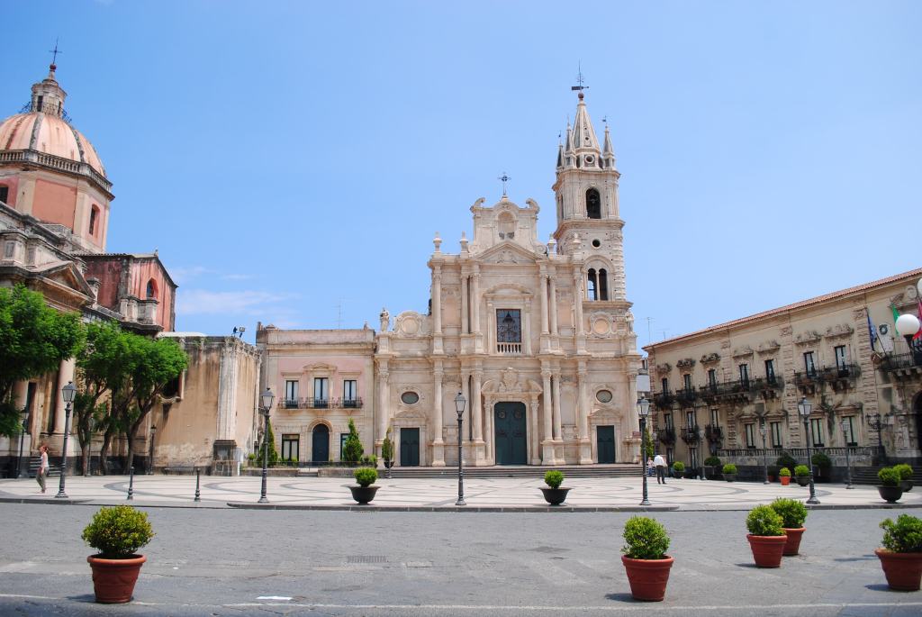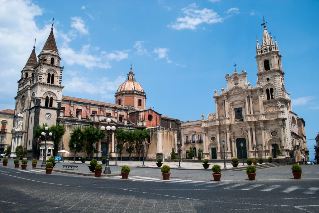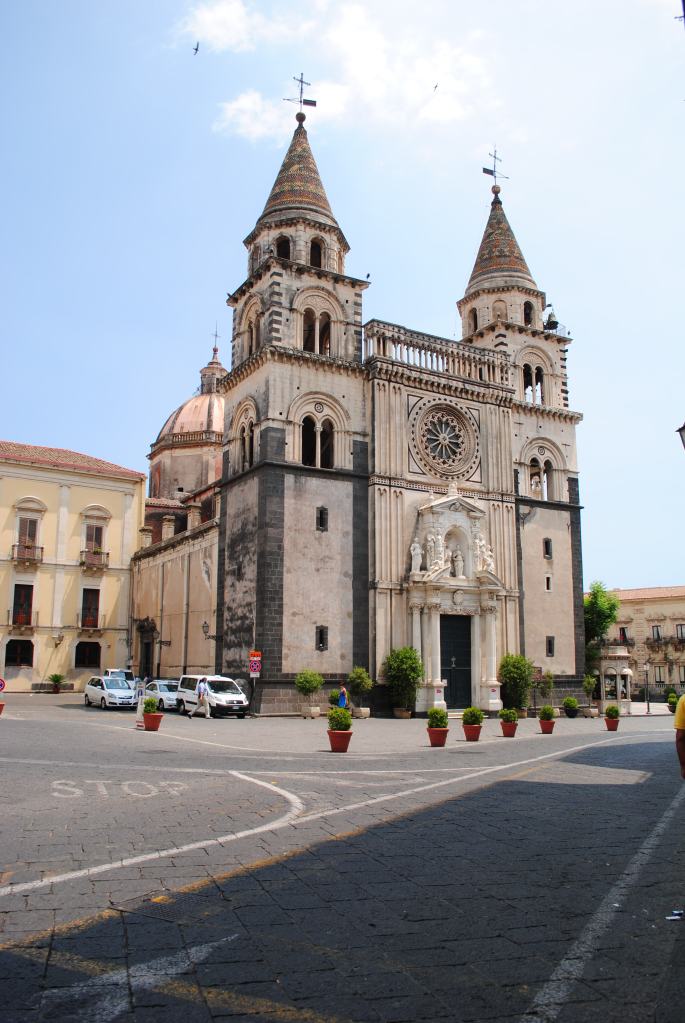 È la nostra prima volta insieme in Sicilia. Sbarchiamo a Messina e la nostra prima tappa sono i paesi di Acireale e Acitrezza, di verghiana memoria. La prima tappa è Acireale, cittadina elegante e ricca di storia. Visitiamo la Basilica dei Santi Apostoli Pietro e Paolo, elevata a Basilica minore pontificia nel 1933, le cui origini risalgono al XVII secolo. Poco distante si trova la Cattedrale di Maria Santissima Annunziata, affacciata sulla splendida Piazza del Duomo, cuore del centro storico. Qui ci soffermiamo ad osservare la piazza nel suo insieme: ciò che colpisce particolarmente è la pavimentazione, che dona armonia e carattere all’intero spazio. La nostra prima sistemazione alberghiera per qualche giorno è a Catania, un hotel spartano, ma tutto sommato pulito.
