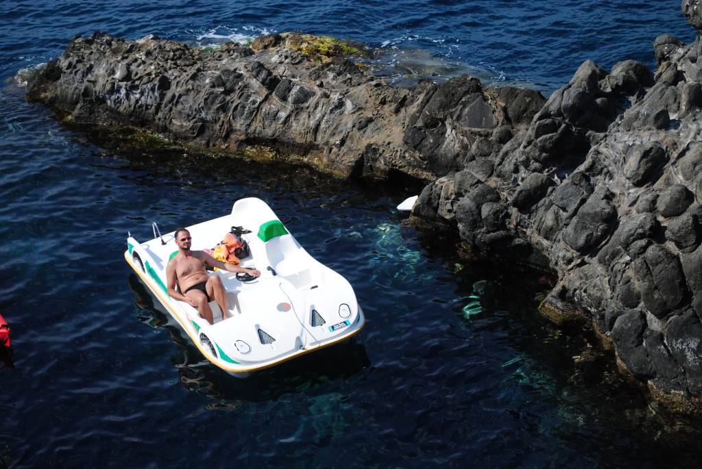 Ma è il mare a regalarci il primo momento indimenticabile del viaggio. Ci spostiamo ad Acitrezza, dove si trovano i celebri faraglioni delle Isole dei Ciclopi. Noleggiamo un pedalò e, con entusiasmo, ci spingiamo fin sotto queste imponenti formazioni rocciose di origine lavica. Raggiungiamo la statua della Madonna dei Faraglioni, dedicata alla Madonna della Buona Nuova. Il contrasto è straordinario: la pietra scura dei faraglioni si staglia contro un mare blu intenso, quasi irreale. È qui che facciamo il nostro primo bagno… e capiamo subito che questo viaggio sarà speciale.