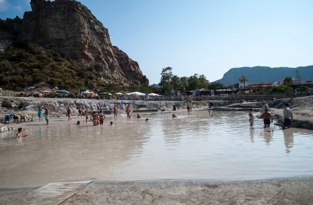 Approdiamo anche nell’isola di Vulcano ed è qui che viviamo uno dei momenti più particolari del viaggio. Ci immergiamo nella celebre Pozza dei fanghi, una vera spa a cielo aperto alimentata da sorgenti termali naturali. Tra vapori e fango, il relax è totale… anche se l’odore di zolfo è talmente intenso da rimanere addosso a lungo, anche dopo esserci allontanati. Vedere l’acqua del mare bollire come in pentola è uno spettacolo particolarissimo.