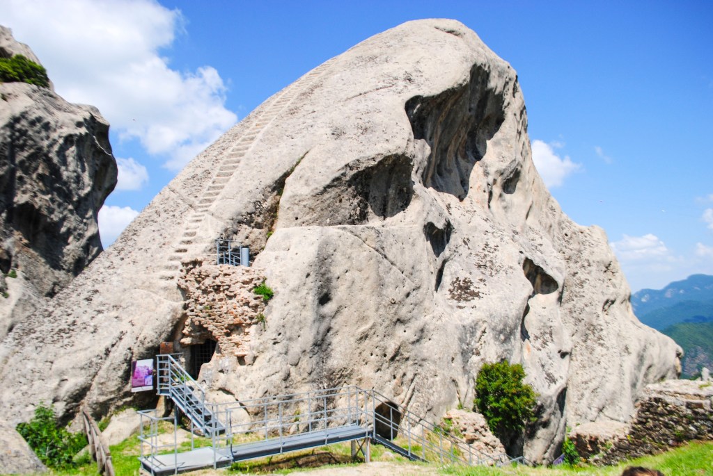 Lo spettacolo paesaggistico lascia davvero a bocca aperta ed è ancora più apprezzabile dall’alto di ciò che resta dell’antico Castello (Castrum medianum), probabilmente risalente all’epoca della dominazione normanna, costruito a ridosso di una montagna. L’unica traccia del Castello è una ripida scalinata, chiamata Gradinata normanna, scavata all’interno roccia, che si perde poi sulla cima, nel punto più alto della località.
