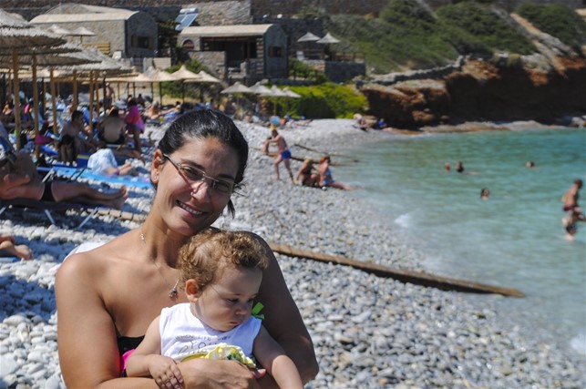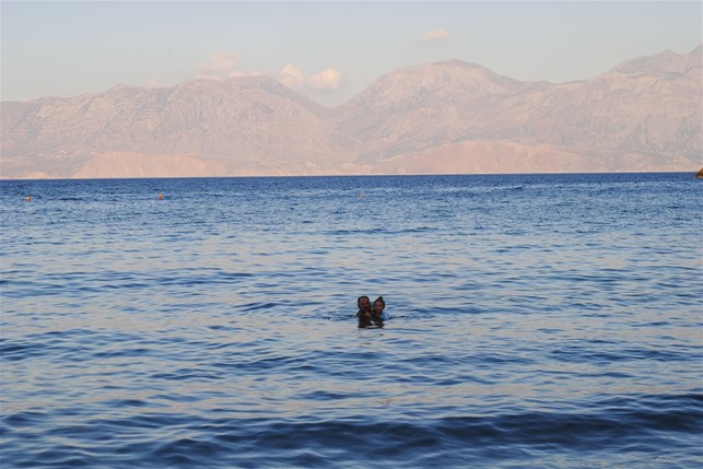La spiaggia sabbiosa, un po’ scura a dire la verità, non è male ed è una novità per le nostre bambine, abituate a spiagge rocciose ed è una buona occasione per divertirsi e impanarsi a dovere. Il panorama che si apre davanti alla spiaggia è molto suggestivo: sebbene il sole tramonti alle spalle, il promontorio e l’Isola di Pseira che si stagliano all’orizzonte sono davvero carine se colpite dagli ultimi raggi di sole della giornata.