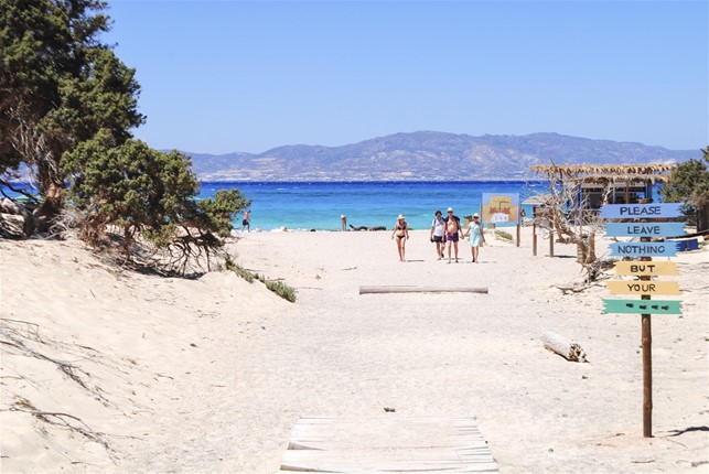 Il porto di Chrissi Island si trova nella parte meridionale dell’isola e sbarcando si possono raggiungere a piedi diverse spiagge, ma le uniche attrezzate si trovano una nei pressi dell’attracco, Vougiou Mati Beach, e una, Belegrina Beach, nella zona nord, che si raggiunge attraversando l’isola nella sabbia rovente. Purtroppo la giornata è molto ventosa, il vento soffia da nord e Belegrina Beach, che poi è anche la spiaggia più bella, non è molto praticabile a causa delle onde che agitano il mare, per cui optiamo per Vougiou Mati Beach, dove il mare è assolutamente piatto e anche fare snorkeling risulta piacevole.