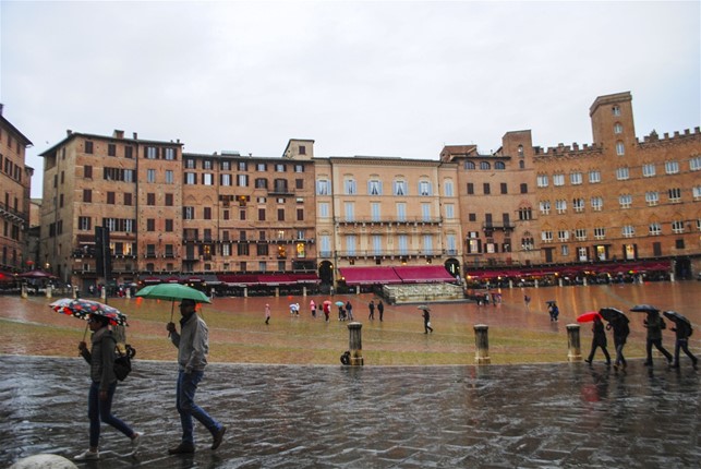 La pioggia aumenta, ma siamo vicini a Siena e non vogliamo rinunciare a visitarla. Quando arriviamo in città, la piaggia è davvero forte, scegliamo un parcheggio vicino alla piazza e ci avventuriamo atrezzati di ombrelli e impermeabili. Un salto fugace per Piazza del Campo, la cui architettura particolare e la funzionalità peculiare è messa in evidenza dal fluire della pioggia, che scorre tutta verso l’estremità che presenta i chiusini, e poi veloce verso il Duomo romanico-gotico della città. Purtroppo siamo arrivati in ritardo, per soli cinque minuti non riusciamo ad entrare, ma vale la pena soffermarsi anche per dieci minuti ad ammirare la facciata in tutti i suoi particolari, a costo di inzupparci.
