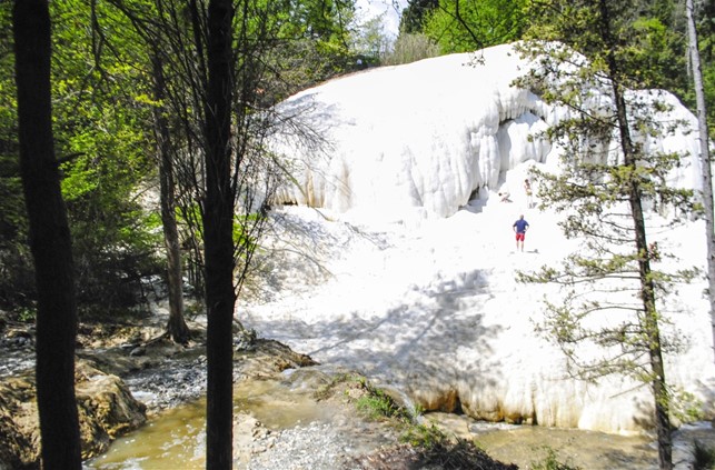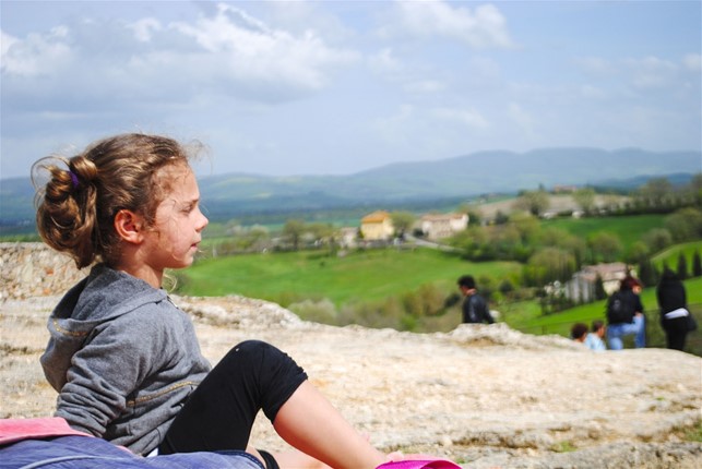 La prima meta della giornata è Bagni San Filippo nel comune di Castiglione d’Orcia nella provincia di Siena. Oltre allo stabilimento termale, c’è una zona libera, detta Fosso bianco, facilmente raggiungibile in macchina, in cui le acque termali scorrono a valle e formano delle pozze in cui è possibile farsi il bagno, ma la cosa più spettacolare da ammirare è la concrezione di carbonato di calcio che forma rocce bianchissime, tra cui la famosa balena bianca. Per raggiungere il sito, si parcheggia la macchina e si percorre un sentiero a tratti ripido e, considerando che il giorno prima ha piovuto, noi lo troviamo decisamente infangato, motivo per cui la nostra Sara non vuole più sentir parlare di Bagnai San Filippo, bollata ormai come «la peggiore avventura della sua vita»! Forse anche a causa delle piogge, le pozze non sono pulitissime, per cui decidiamo di non bagnarci e proseguire oltre, anche perché siamo già abbastanza infangati!
