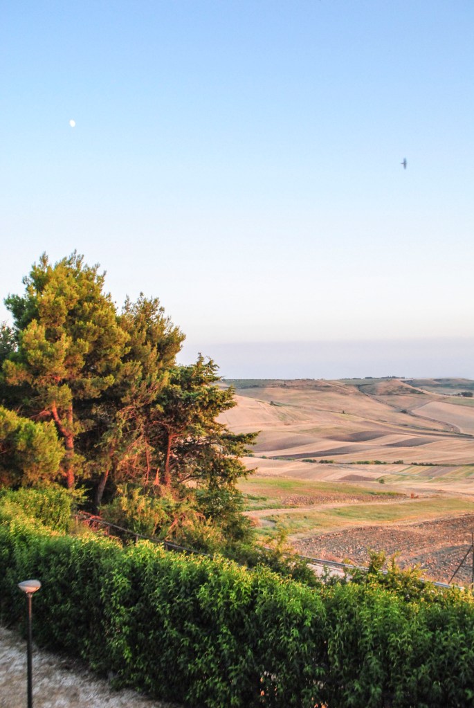 Il borghetto si dipana lungo una sola strada principale, possiede una sola piazza centrale con un palazzo ducale in pietra bianca locale e un poggiolo, dal quale si può ammirare a perdita d’occhio la bellezza dei campi coltivati a grano…uno spettacolo da gustare soprattutto al tramonto (in basso), quando il sole cala ad ovest dietro le colline.