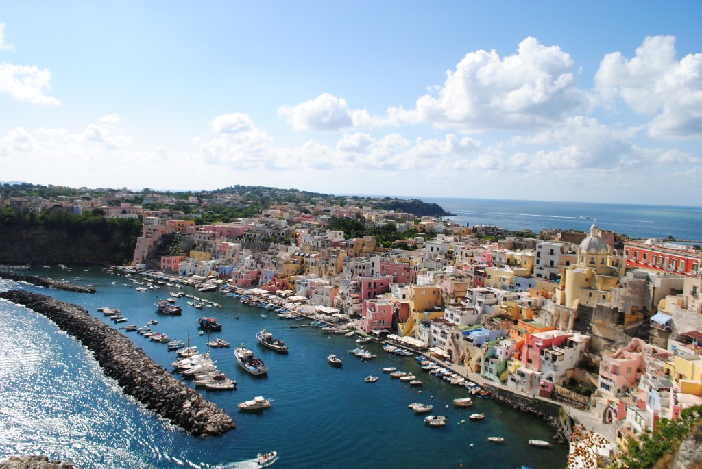 Nel pomeriggio si decide di fare un salto sull’Isola di Procida con una motonave da Ischia. Arrivati al porto, scegliamo di farci accompagnare nei punti panoramici strategici da un tassista locale, che ci racconta la sua vita da marinaio e tutti i segreti di un’Isola così graziosa, ma così diversa nel suo paesaggio da Ischia. Curiosa è la storia della case colorate, così come ce l’ha raccontata il nostro cicerone/tassista: il vero motivo sta nel fatto che grazie ai differenti colori, che tutt’oggi sono l’icona di Procida, i pescatori avrebbero potuto riconoscere da lontano le loro abitazioni. Incredibile è anche riuscire a capire come faccia a guidare tutti i giorni il nostro tassista nei vicoli della cittadina, larghi solo qualche centimetro in più dell’autovettura, al punto che l’uomo è attrezzato di asta telescopica per chiudere gli specchietti laterali nei vicoli più impegnativi!