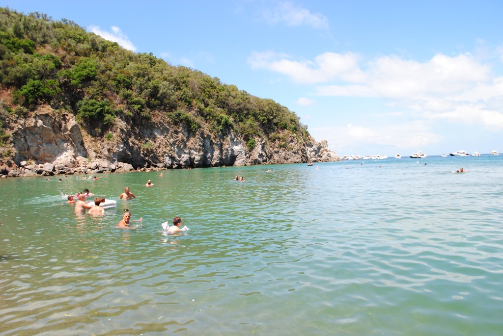 Per il secondo giorno si è stabilita una tappa imprescindibile da visitare sull‘Isola d’Ischia: la Baia di Sorgeto con le sue acque bollenti! Da Casamicciola Terme bisogna raggiungere il lato opposto dell’isola, dove si trova il comune di Forio, parcheggiare nei pressi dell’Antica Fattoria Greca di Punta Chiarito – Azienda Agricola Ruffano, dove, tra l’altro, al ritorno dalla spiaggia si può approfittare per un ottimo aperitivo casereccio, e attrezzarsi di buon umore e forze fisiche per affrontare i 250 scalini che portano già al mare. Certo, non aspettatevi una spiaggia attrezzata e agevole, anzi, l’unico stabilimento presente è anche chiuso, ma soprattutto l’ingresso in acqua è molto scivoloso, per cui occorre fare molta attenzione. La particolarità della Baia di Sorgeto, tuttavia, sta nel fatto che dagli scogli, a ridosso dell’ingresso in acqua, sgorga acqua bollentissima, da scottatura, che con l’acqua fresca del mare crea delle pozze termali in cui è piacevole crogiolarsi.