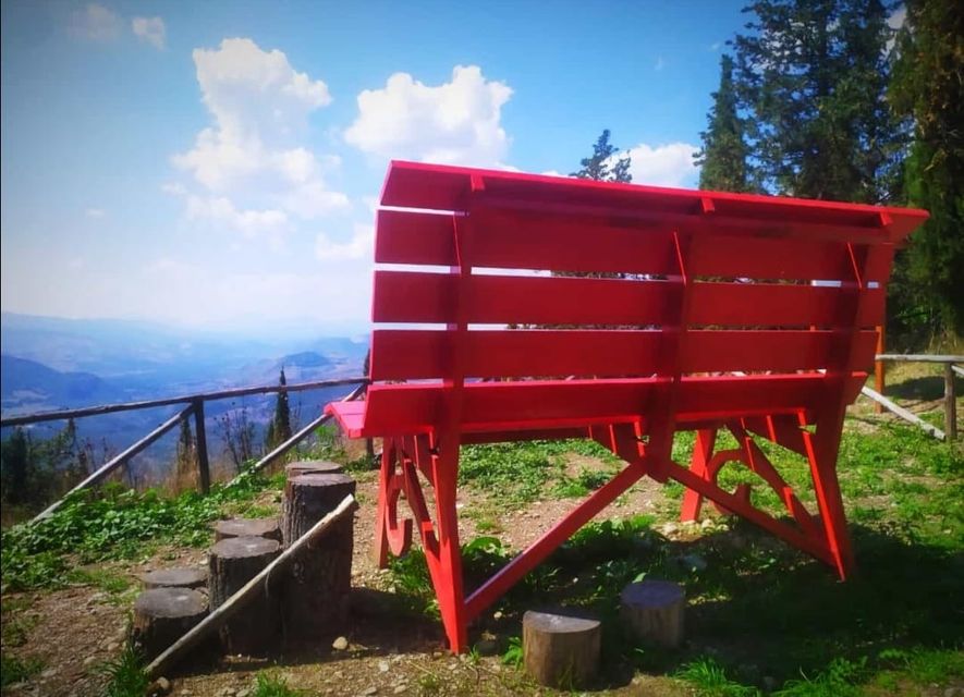 Alla fine dell’impegnativo percorso sterrato, che le nostre bambine hanno condotto tranquillamente, sul cucuzzolo della montagna si trova la panchina di colore rosso. Nelle intenzioni dell’associazione che si è impegnata per l’installazione il rosso vuole sensibilizzare nei confronti della lotta contro ogni tipo di discriminazione. Ad ogni modo, dalla Big Bench si apre davanti a sé uno scenario davvero incantevole.