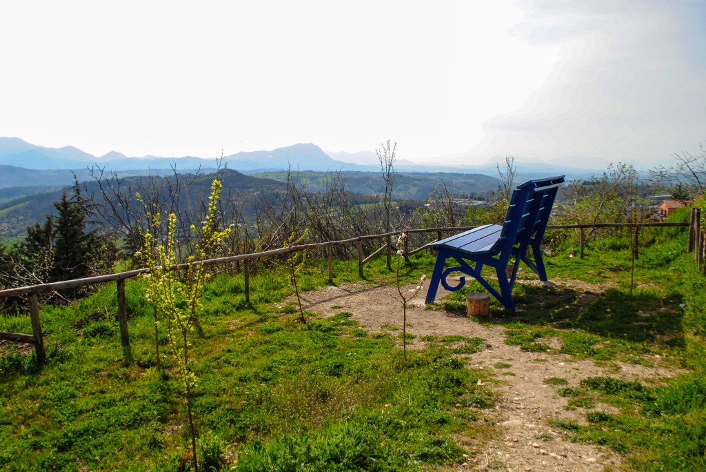 La panchina si trova nel Parco della Memoria di Sant’Angelo dei Lombardi, testimonianza del terribile terremoto del 1980, che distrusse gran parte dell’Irpinia. È consigliabile lasciare le auto all’esterno del parco per poi incamminarsi fino alle rovine di Santa Maria delle Grazie, davanti alle quali si trova la Big Bench di colore azzurro, simbolo anche della fragilità dell’autismo, sulla quale la comunità ha voluto in qualche modo sensibilizzare. Dalla panchina è possibile ammirare tutta la distesa di vitigni irpini e, dobbiamo confessare, la visione è davvero mozzafiato!