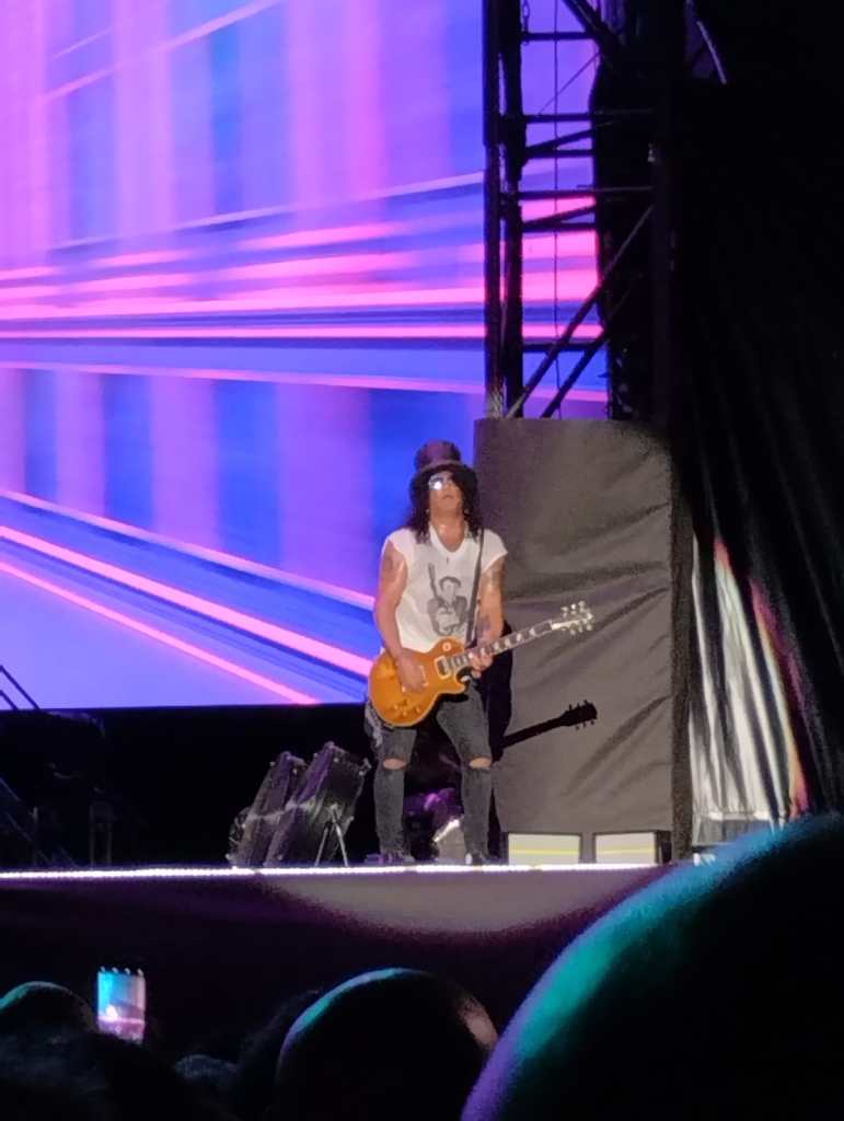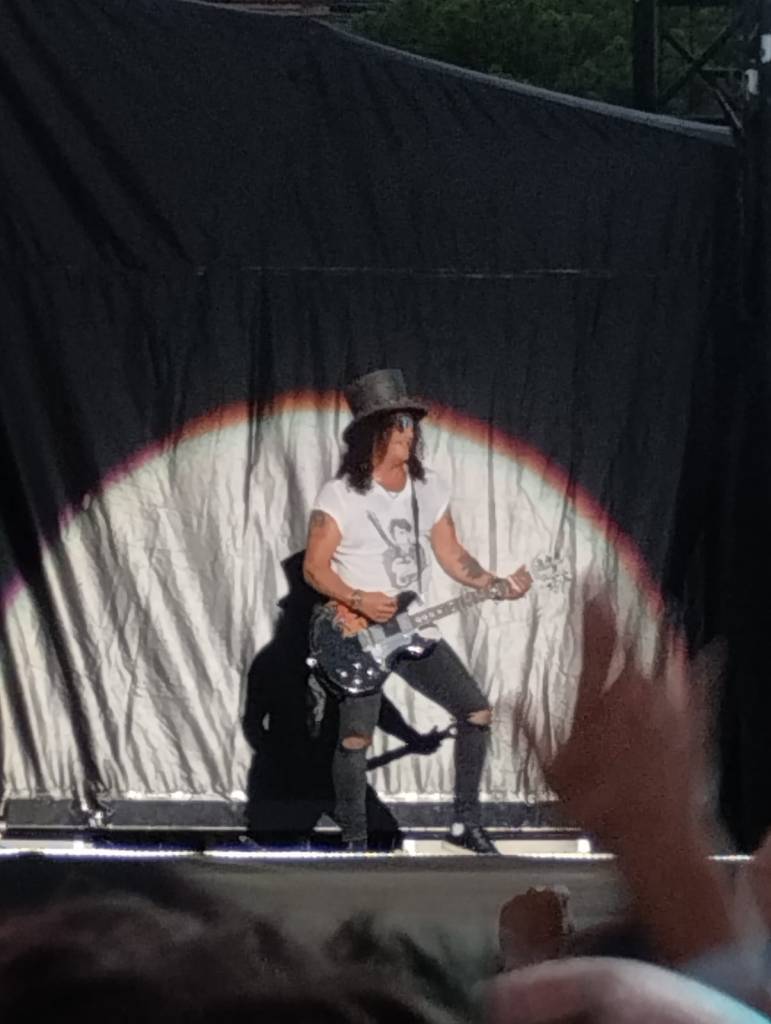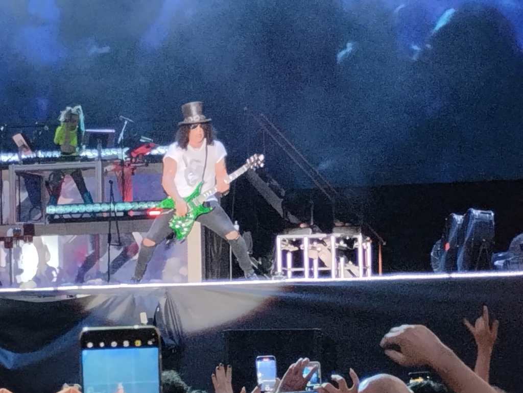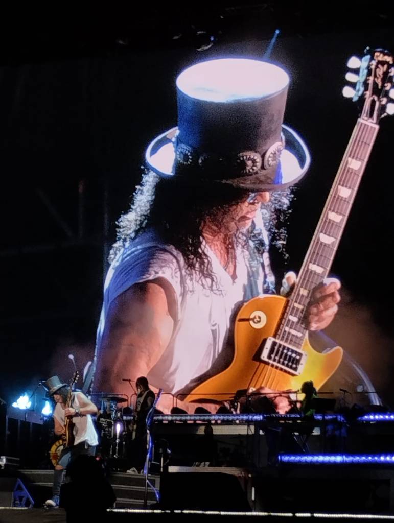 Sapevamo che la voce di Axl Rose non sarebbe stata la stessa di un tempo, d’altronde era folle pensare di poter mantenere ancora a 61 anni tutte le cinque ottave di estensione vocale, ma uno spettacolo live di 3 ore e un quarto senza alcuna interruzione dal Golden Circle (PIT) finora non ce l’aveva regalato nessuno. Axl era davvero in forma sul palco, a suo agio come un tempo, certo un po’ appesantito, come noi del resto, ma il suo ancheggiare sulle note di Pretty tied up, il suo percorrere il palco in lungo e largo ci ha fatto rivivere gli anni d’oro della band. Bastava chiudere gli occhi e la musica faceva riaffiorare alla mente quei fotogrammi in cui a passi larghi con la fascia in fronte a raccogliere la folta chioma lunga e bionda, la camicia a quadroni legata al cinto e il microfono di spugna giallo viveva i suoi momenti migliori.