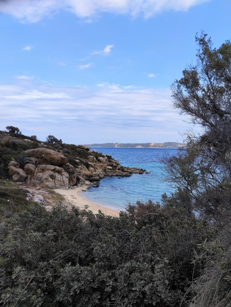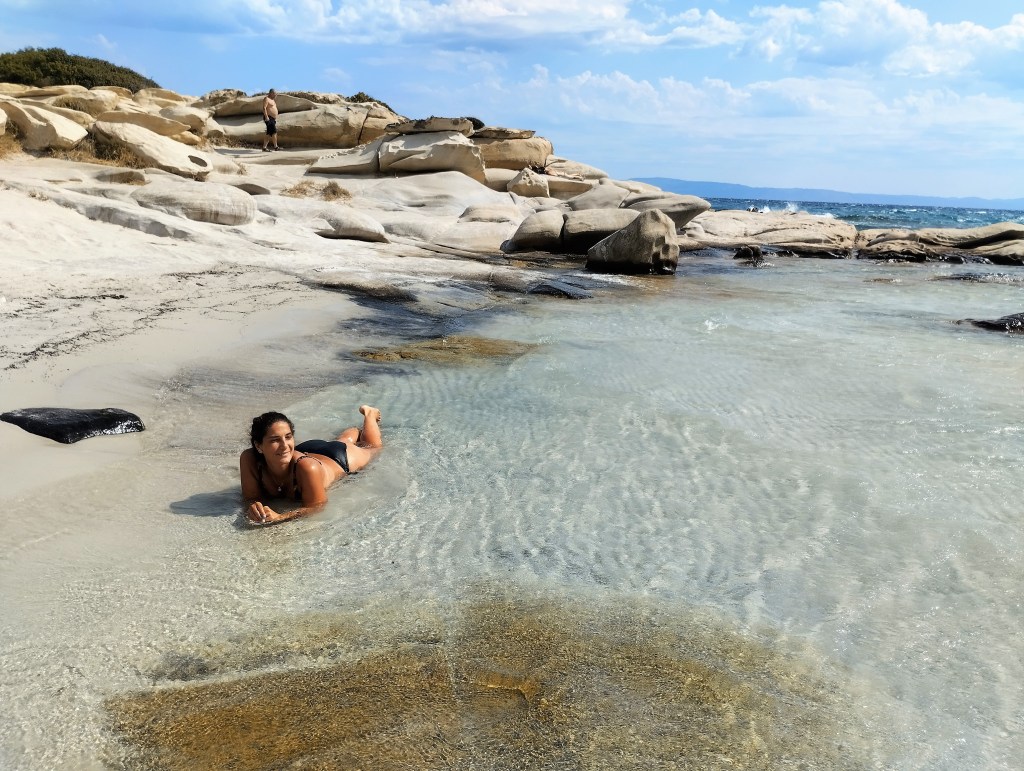 Oggi andiamo all’esplorazione di Sithonia, il dito centrale della Penisola Calcidica, e in meno di un’ora dal nostro hotel siamo a Karidi Beach, da noi ribattezzata la Piccola Seychelles 😎 in virtù delle rocce che affiorano ai lati della spiaggia sabbiosa. Purtroppo anche oggi c’è vento e molta corrente sul versante est della Calcidica, il mare si presenta leggermente increspato, ma ciò non toglie nulla alla possibilità di fare un rinfrescante bagno nelle basse acque e delle bellissime foto!