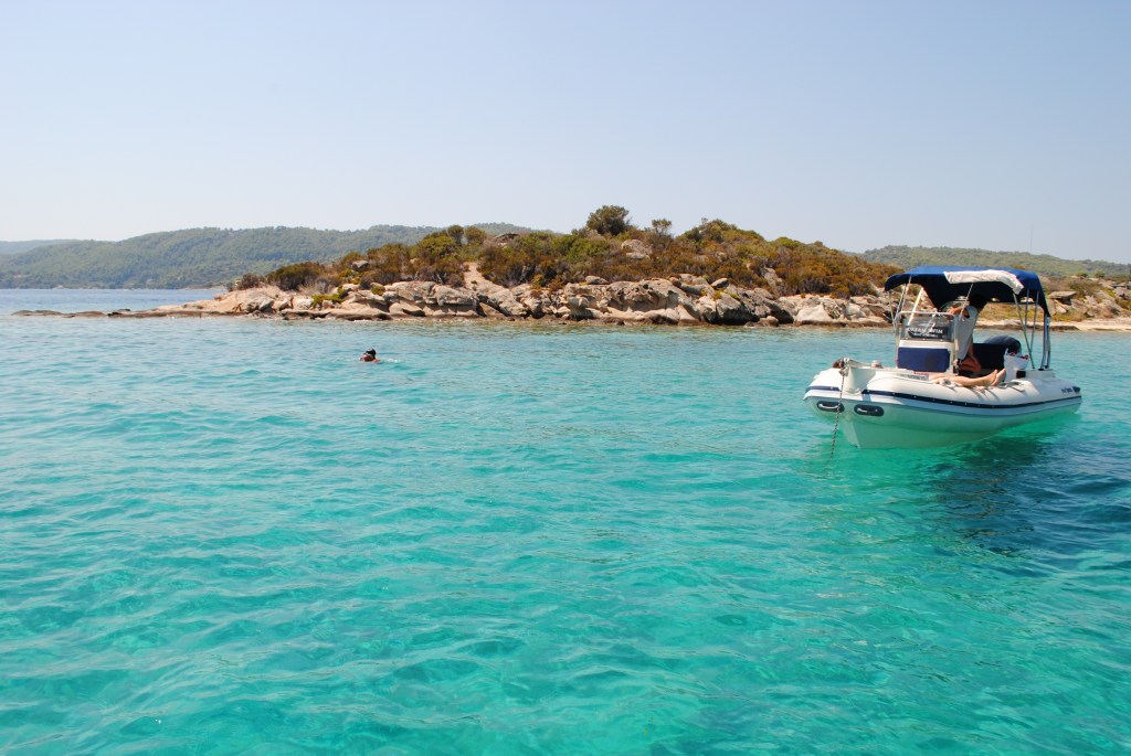 Ovviamente, con il cambio di programma e il tempo incerto, non ce la siamo sentiti di prenotare in anticipo un motoscafo, per cui ci rechiamo di prima mattina a Vourvourou e facciamo il giro di tutti i noleggi, sperando di trovare qualche imbarcazione disponibile (anche a remi!), ma nulla! Quando stavamo perdendo tutte le speranze, si affaccia una proposta allettante, sebbene più dispendiosa, dal noleggio Barracuda: uscita dalle 11.30 alle 16.00 in motoscafo da 150 cc con skipper….accettiamo al volo!
