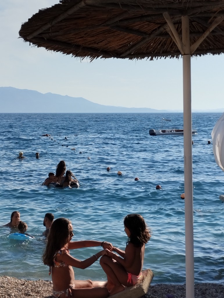 La passeggiata culturale nella cittadina sotto il sole cocente di agosto ci ha un po’ sfiancati e anche le bambine reclamano un po’ di mare dopo due giorni di astinenza! La meta è la spiaggia di Epanomi, la più vicina a Salonicco, una distesa di kilometri di spiaggia libera su due versanti, uno con affaccio a nord, solitamente un po’ crespo, e uno rivolto a sud, non esposto a correnti, per cui è una vera tavola, poco affollata con una sabbia molto grossolana e un mare cristallino con tanta fauna…per gli amanti dello snorkeling.