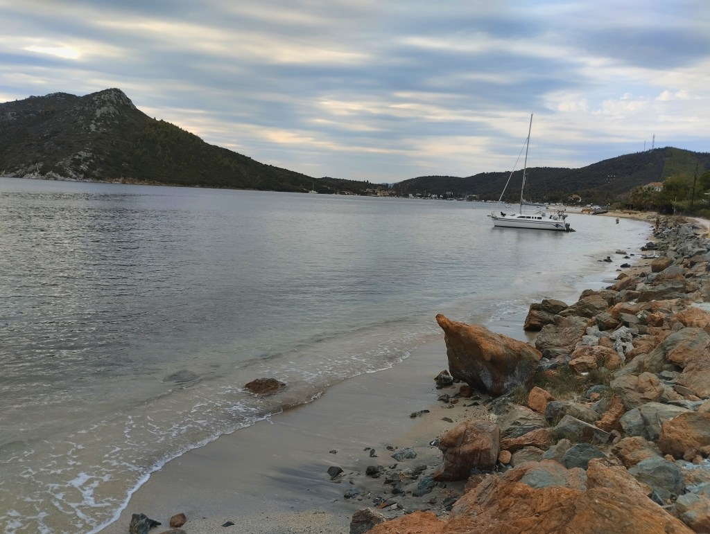 Nel pomeriggio avanzato decidiamo di proseguire il giro di Sithonia ed è allora che scopriamo che il mare sul versante ovest è una tavola, ma la fame ormai si fa sentire e optiamo per un pranzo/cena di pesce alle 17.00 nella taverna Porto Marina a Porto Koufo, un paesino di pescatori collocato all’interno di un golfo, quasi un fiordo, dalle acque invitanti con riflessi color smeraldo dalle quali sono visibili molti enormi ricci di mare.