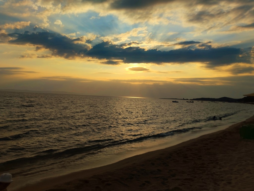 Una volta sbarcati dal traghetto, ci dirigiamo verso la spiaggia di Ouranopoli, nel lido attrezzato del Thalassa Beach Bar and Restaurant, nel quale alla modica cifra di 8 euro (due consumazioni) occupiamo un ombrellone e due lettini. È arrivato il momento di farsi un bel bagno in una spiaggia dalla sabbia fine e bianca con tantissima fauna, tra cui polpi, ricci, diversi e colorati pesci, mentre il sole comincia a fare capolino e restituisce al mare le sue splendide sfumature, dopo essersi preso due giorni di riposo!