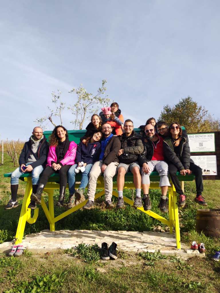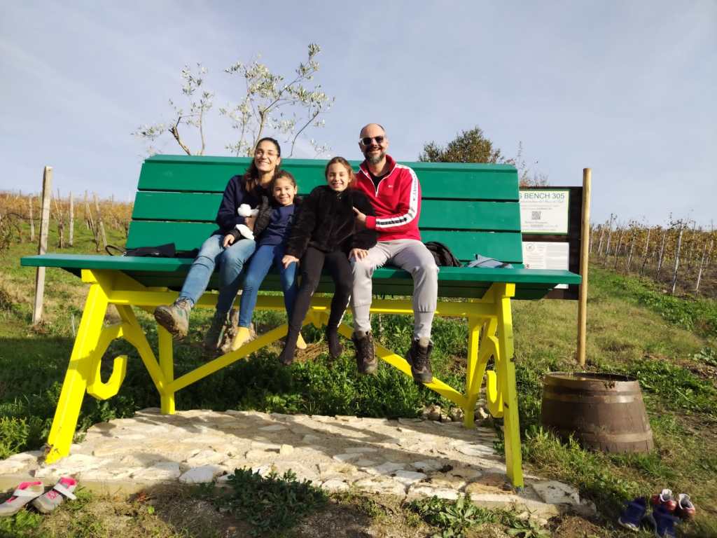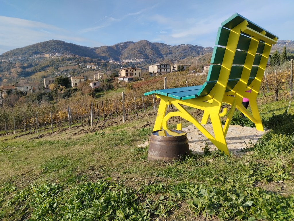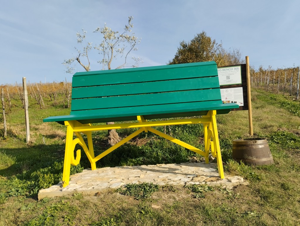 Non è stato facile trovarla, anche perché sia il navigatore sia l’applicazione Tabui, che di solito è molto precisa, rimandano in aperta campagna e della Big Bench non c’è nemmeno l’ombra. Abbiamo dovuto telefonare al riferimento della stessa Tabui per ricevere indicazioni più precise. La panchina è collocata dietro un vigneto nel paese di Picoli frazione di Santa Paolina, non molto visibile dalla strada, ma agevolmente raggiungibile a piedi…basta non aver paura di sporcarsi di fango!!!