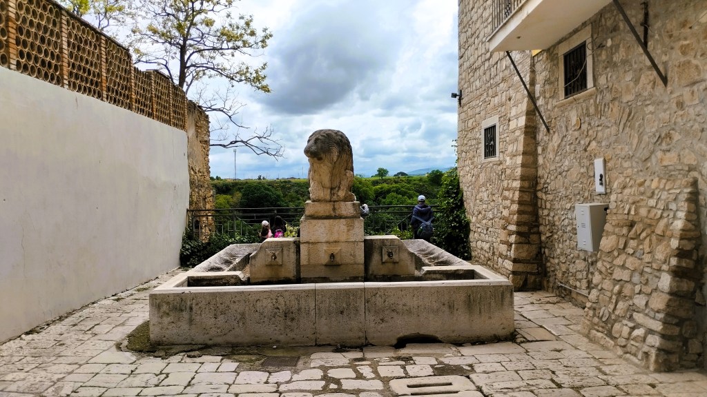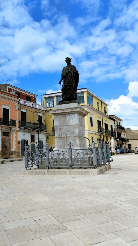 Ci spostiamo nel paese e andiamo alla ricerca della fantomatica casa di Orazio, di fatto non vi è alcuna testimonianza reale che quel luogo sia stato la dimora effettiva del poeta. Una volta arrivati, possiamo constatare che si tratta di un edificio di epoca romana aperto al pubblico, ma non ha affatto le sembianze di una casa a causa della forma circolare. Ci spingiamo nei vicoli e attraversiamo le strade, incontrando la Fontana angioina, che rappresenta l’ingresso nel centro storico, da qui ci spostiamo verso il Castello Aragonese, prima però ci fermiamo ad ammirare la statua del poeta nella piazza a lui dedicata.