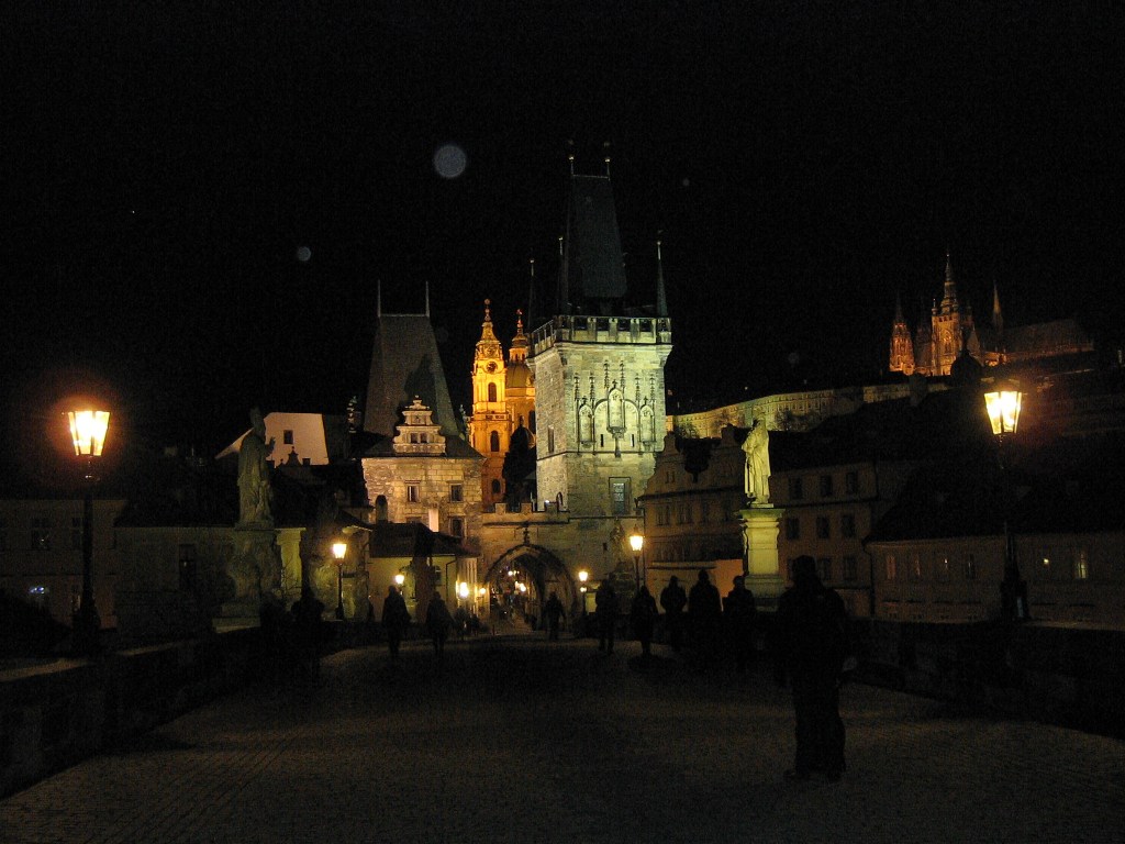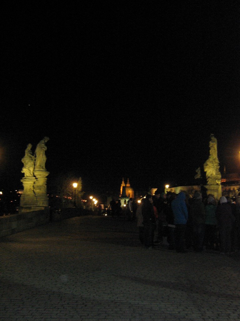 Concludiamo la giornata attraversando il suggestivo Ponte Carlo, avvolto da un’atmosfera quasi surreale, tra luci soffuse e artisti di strada. Il vento gelido sferza il viso e rende l’esperienza ancora più intensa, quasi a volerci ricordare che siamo davvero nel cuore dell’inverno europeo. Le statue che costeggiano il ponte, una dopo l’altra, sembrano osservare silenziose il passaggio dei viaggiatori: figure sacre e storiche che aggiungono un senso di solennità e mistero. Camminare qui è come attraversare un museo a cielo aperto, sospeso tra storia e leggenda.