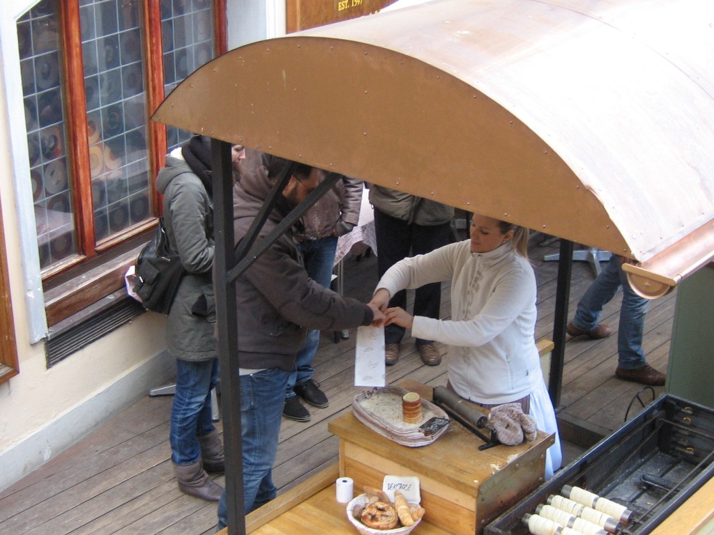 Attraversiamo poi le Torri del Ponte di Malá Strana, antico ingresso al quartiere omonimo, e ci concediamo una pausa golosa con un dolce tipico caldo, il Trdelnik o abbrevviato Trdlo, noto in italiano come manicotto di Boemio, pasta lievitata dolce, arrotolata sul tipico cilindro cotta alla brace, ricoperto di zucchero e cannella. Con il dolce tipico tra le mani dolce, il Trdelnik o abbrevviato Trdlo, noto in italiano come manicotto di Boemia, fatto di pasta lievitata dolce, arrotolata sul tipico cilindro cotta alla brace, ricoperto di zucchero e cannella, ci fermiamo ancora una volta sul Ponte Carlo, osservando il continuo via vai di persone e artisti: qui il tempo sembra rallentare.